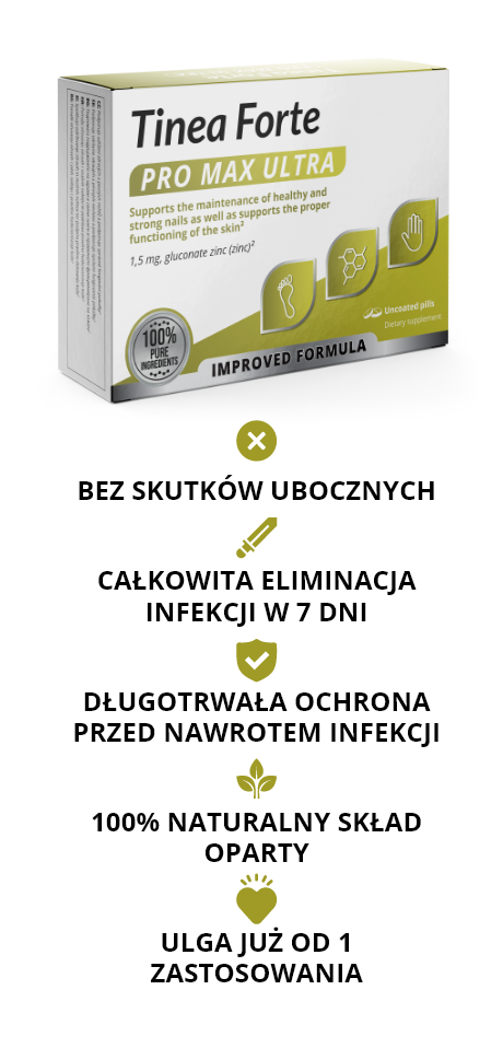 Antygrzybicza formuła Tinea Forte PRO MAX ULTRA jest od niedawna dostępna również w Polsce – zamówić ją można wyłącznie za pośrednictwem tej strony internetowej. Producent przygotował niezwykłą promocję dla 100 pierwszych osób z Polski. Otrzymają one opakowanie kuracji Tinea Forte PRO MAX ULTRA całkowicie ZA DARMO! Decyduje kolejność zgłoszeń.